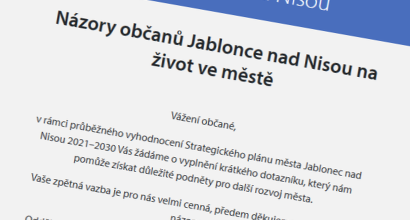 30.09.2025 - Město Jablonec nad Nisou aktuálně provádí průběžné vyhodnocení Strategického plánu rozvoje na období 2021–2030. V této souvislosti vás prosíme o vyplnění krátkého dotazníku, jehož cílem je shromáždit názory a podněty obyvatel města.